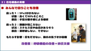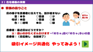 例えば、「多い」や「固い」という指標があったとして、目の前で同時に評価できるなら一致した理解が得られ、これにより吸引回数を増やしたり、吸入やタッピングの判断や、感染症リスク対策などの情報共有ができます。
