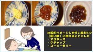 そこで在宅素人ながら、もう少しみんなのイメージが一致できそうな評価基準ということで、痰の感触を食材でイメージできないかと訪問看護師さんに協力を終えお願いし、実験をしてみました。