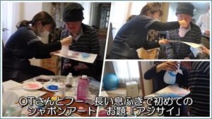 恐る恐る始めた割に、以外と楽しいんだと理解したのか、その後65cm、75cmのボールにも座れるようになりました。今後の看護・リハビリ計画策定としてステーションの皆さんが考えてくださり、「バランスボールやりながら APT.(アパトゥ)」がいいんじゃないかと案がまとまりました。
