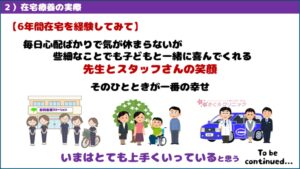 訪問の様子は、お父様が作成された動画のように、訪問スタッフと患者様、ご両親様との楽しい関わり(支えあい ともに歩む)を皆様にも見ていただけたと思いますが、行くたび、行くたびに息子さん(患者)の笑顔と、ご両親様が私たちを優しく受け入れてくださるところが本当に素敵なご家庭だと思っています。