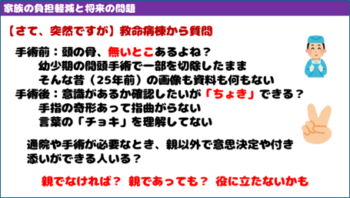 親でなければわからない、できない例として、過去の手術歴、現在の知能の理解度などの情報をお伝えするということです。今は電子化されたカルテや画像、動画などの情報を共有することができますが、25年前の手術となると当時の執刀医のみなさんも退任されていますので、「なに」が、「どう」は親しか知りません。