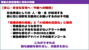 在宅療養が続くことを前提に、家族と支援いただく医療者の負担の軽減を考えると、昨今急速な発展を遂げている「AI技術」の医療、福祉分野での活用が最もマッチすると思います。